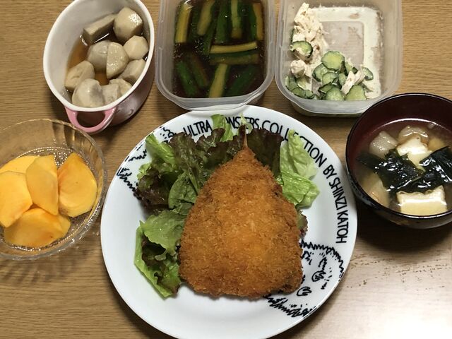 ・アジフライ&レタス・残り物たち・味噌汁・柿・ネギトロ巻き