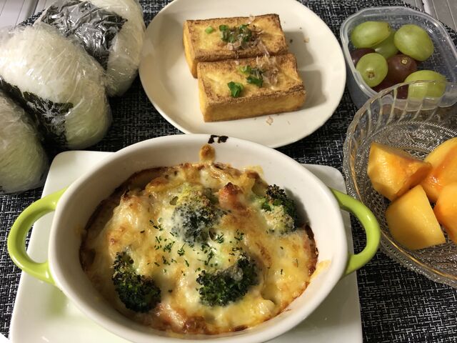 ・グラタン・焼いただけ厚揚げ・おにぎり・柿&ブドウ