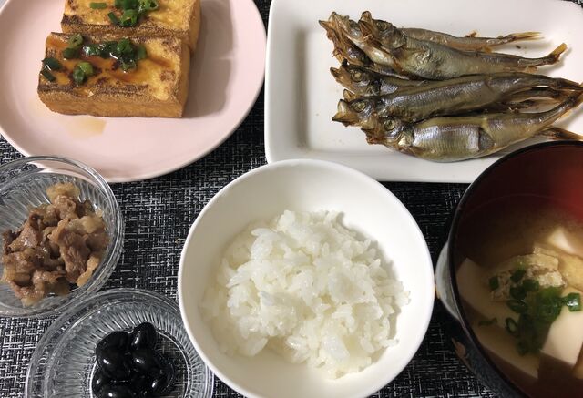 ・ししゃも・焼いただけ厚揚げ・黒豆・牛肉のしぐれ煮っぽいやつ