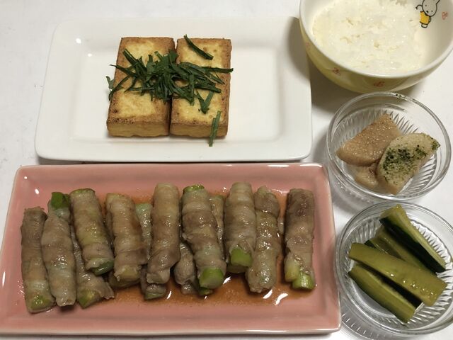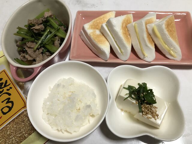 ・はんぺんチーズ焼き・小松菜と豚小間炒め・冷奴・ご飯