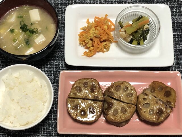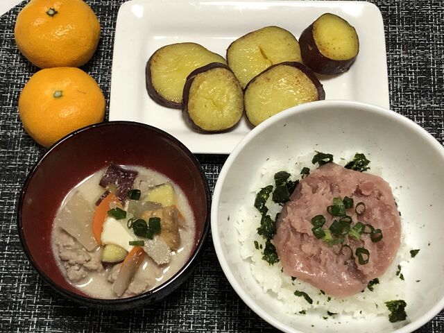・鶏胸の竜田揚げ・蒸しサツマイモ・人参しりしり・小松菜煮浸し・粕汁