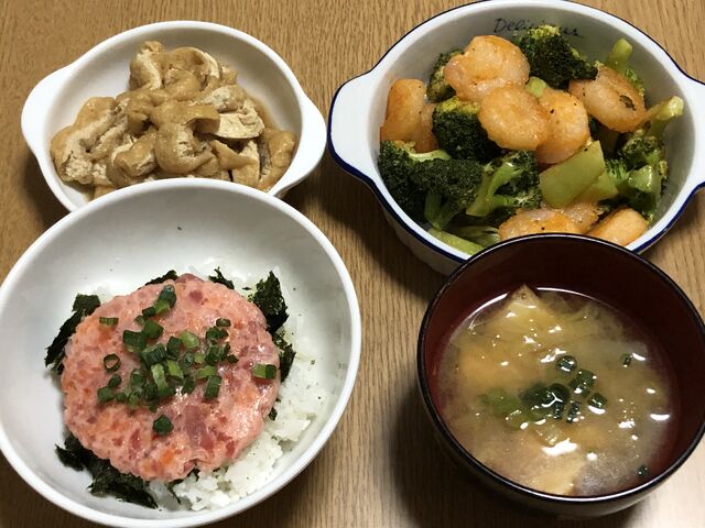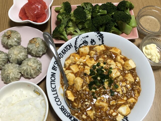 ・麻婆豆腐・ニラ饅頭・茹でブロッコリ・タラコ・ご飯