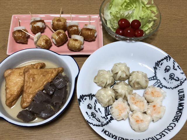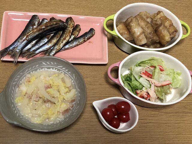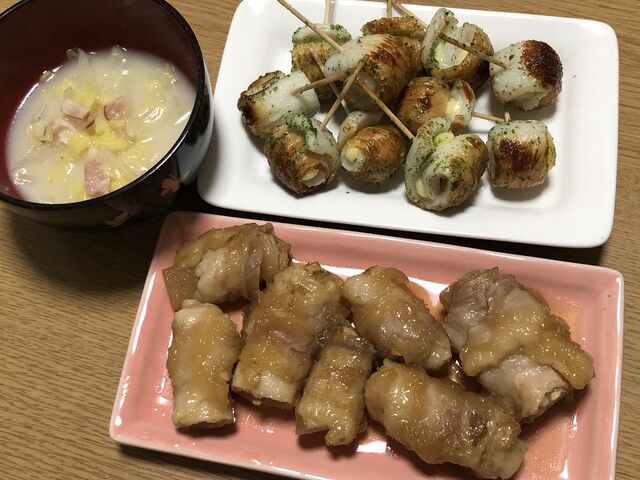 ・豚肉くるくる・竹輪チーズくるくる・白菜とベーコンのミルクスープ